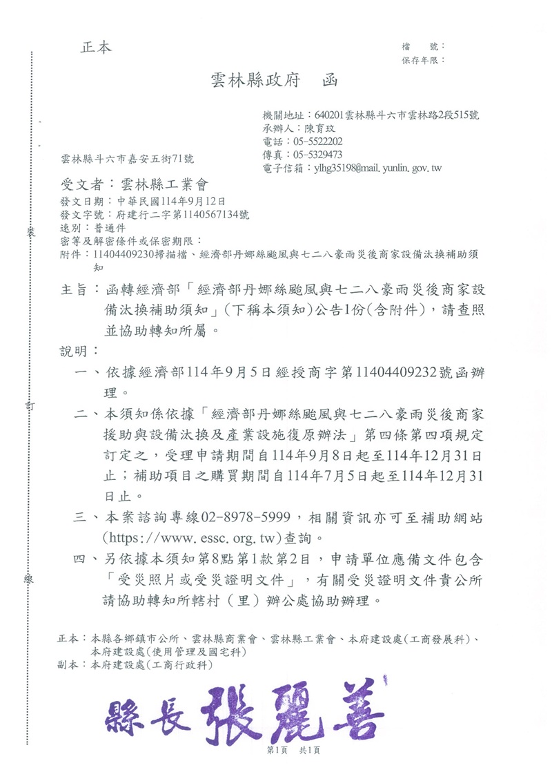 (轉知) 函轉經濟部「經濟部丹娜絲颱風與七二八豪雨災後商家設備汰換補助須知」(下稱本須知)公告1份(含附件),請查照並協助轉知所屬