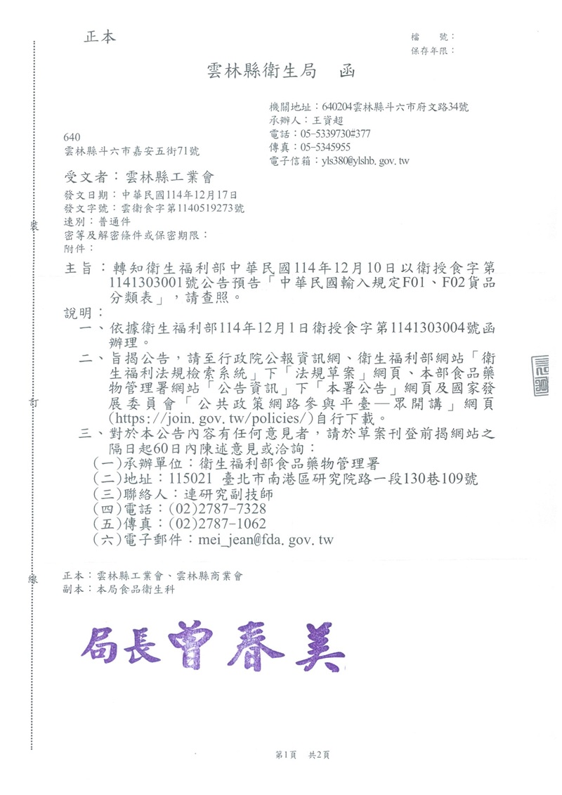 (轉知) 轉知衛生福利部中華民國114年12月10日以衛授食字第1141303001號公告預告「中華民國輸入規定F01、F02貨品分類表」,請查照