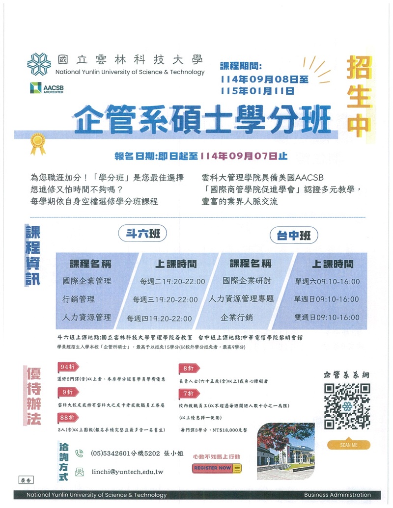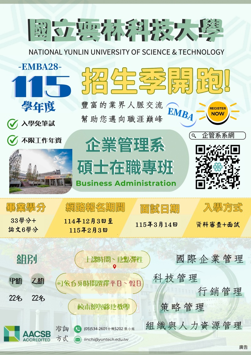 (轉知) 國立雲林科技大學115學年度企業管理系EMBA28碩士在職專班及學分班,熱烈招生中。