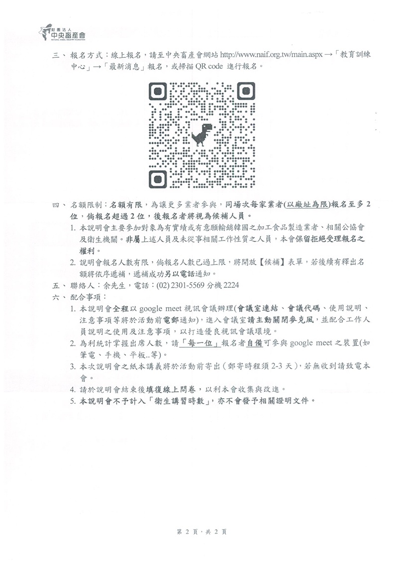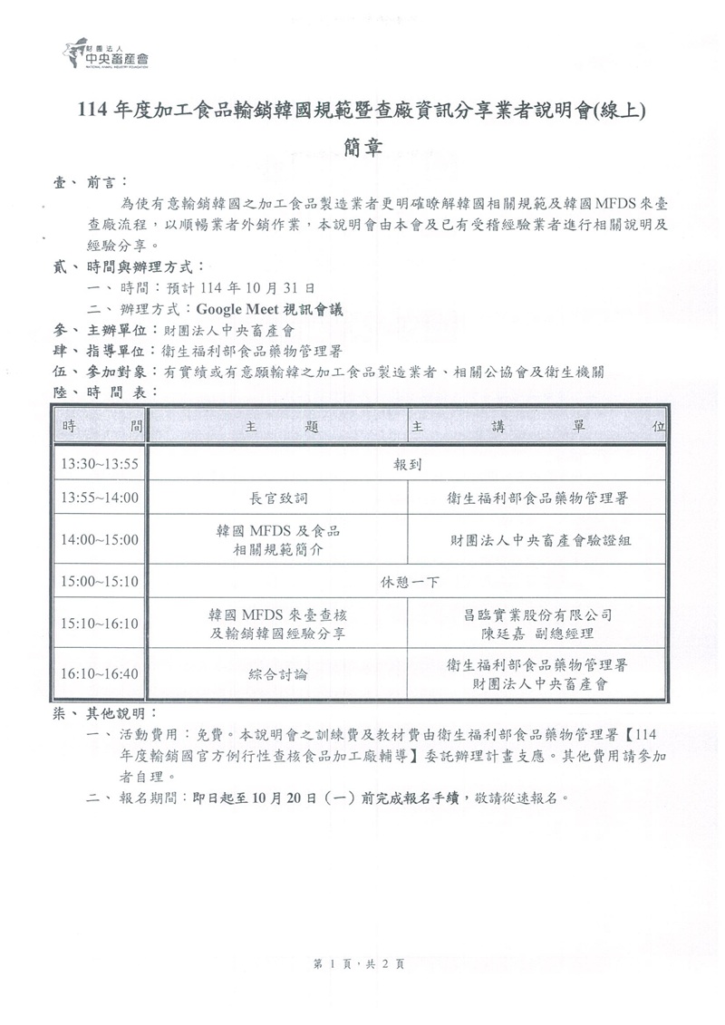 (轉知) 函轉財團法人 中央畜產會辦理「114年度加工食品輸銷韓國規範暨查廠資訊分享業者說明會(線上)」簡章1份,請轉知所屬會員踴躍參加,請查照