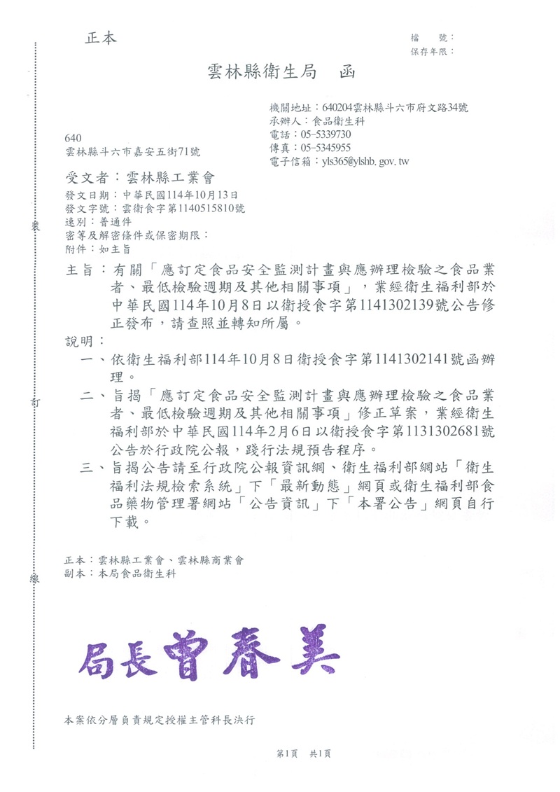 (轉知) 有關「應訂定食品安全監測計畫與應辦理檢驗之食品業者、最低檢驗週期及其他相關事項」,業經衛生福利部於中華民國114年10月8日以衛授食字第1141302139號公告修正發布,請查照並轉知所屬