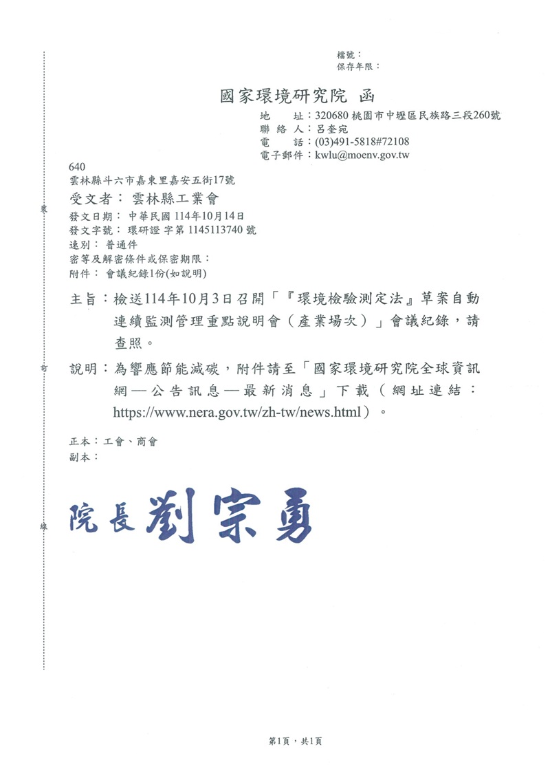 (轉知) 檢送114年10月3日召開「『環境檢驗測定法』草案自動連續監測管理重點說明會(產業場次)」會議紀錄,請查照